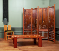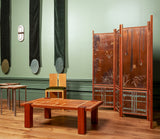 In the Copper room divider, brown and green patinas are applied to copper panels to add textural depth and painterly depictions, interwoven with oil painting and carved etchings. The room divider portrays a colorful spring bloom, bursting with flowers, leaves, and trees atop a vine geometry below. The four panels are supported by mahogany frames in a sculptural design that grounds the piece.