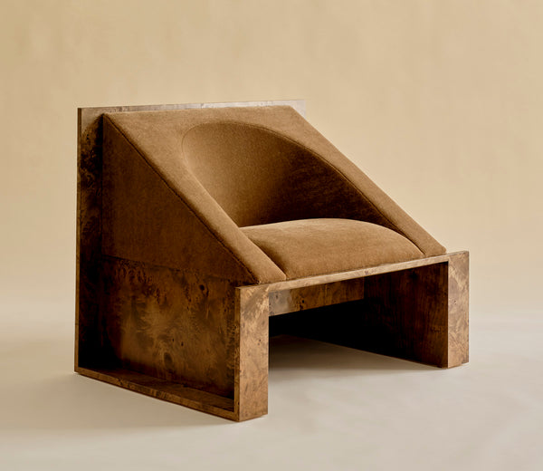 A graceful articulation of comfort through form, the Perceptions chair explores the relationship between upholstery and framework. Its soft, sculpted interior creates contours within a linear form. Available with a burl or maple frame and a selection of high quality fabrics or COM. (Shown here in chestnut mohair and pink velvet.) Other customizations are available on a case-by-case basis.